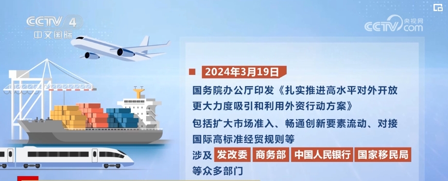 2024年3月19日,國務(wù)院辦公廳印發(fā)《扎實(shí)推進(jìn)高水平對外開放 更大力度吸引和利用外資行動方案》,包括擴(kuò)大市場準(zhǔn)入、暢通創(chuàng)新要素流動、對接國際高標(biāo)準(zhǔn)經(jīng)貿(mào)規(guī)則等,涉及國家發(fā)展改革委、商務(wù)部、中國人民銀行、國家移民局等眾多部門。