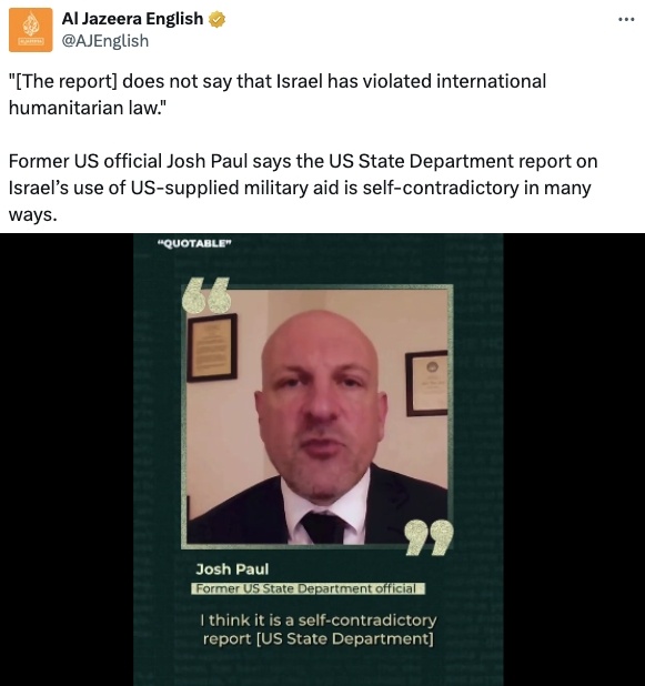 因不滿拜登政府巴以政策而于去年10月辭職的美國(guó)國(guó)務(wù)院政治軍事事務(wù)局前主任喬?!けA_認(rèn)為,這是一份自相矛盾的報(bào)告,沒(méi)有從所確定的事實(shí)中得出合乎邏輯的結(jié)論。