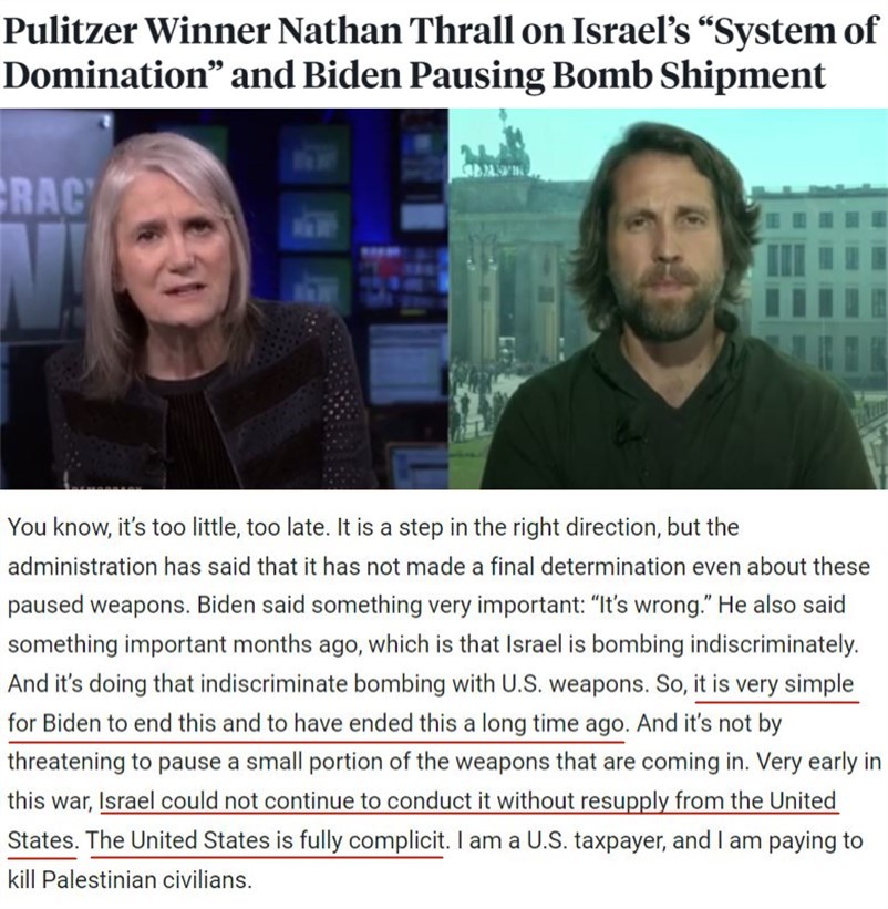對(duì)此,常駐耶路撒冷的美國(guó)記者兼知名作家內(nèi)森·薩爾一針見(jiàn)血地指出,對(duì)于拜登來(lái)說(shuō),結(jié)束這一切其實(shí)很簡(jiǎn)單,而且早該結(jié)束了,不必像現(xiàn)在這樣通過(guò)威脅暫停供應(yīng)一小部分武器來(lái)實(shí)現(xiàn)。