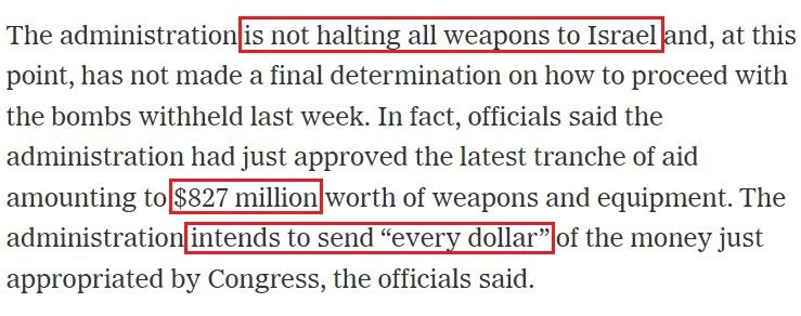 事實(shí)上,就在暫停向以色列運(yùn)送重型炸彈的同時(shí),拜登政府剛剛批準(zhǔn)了最新一批價(jià)值8.27億美元的對(duì)以軍事裝備援助。用美國(guó)官員們的話說(shuō),拜登政府打算把最新對(duì)以援助撥款的“每一美元”都用出去。