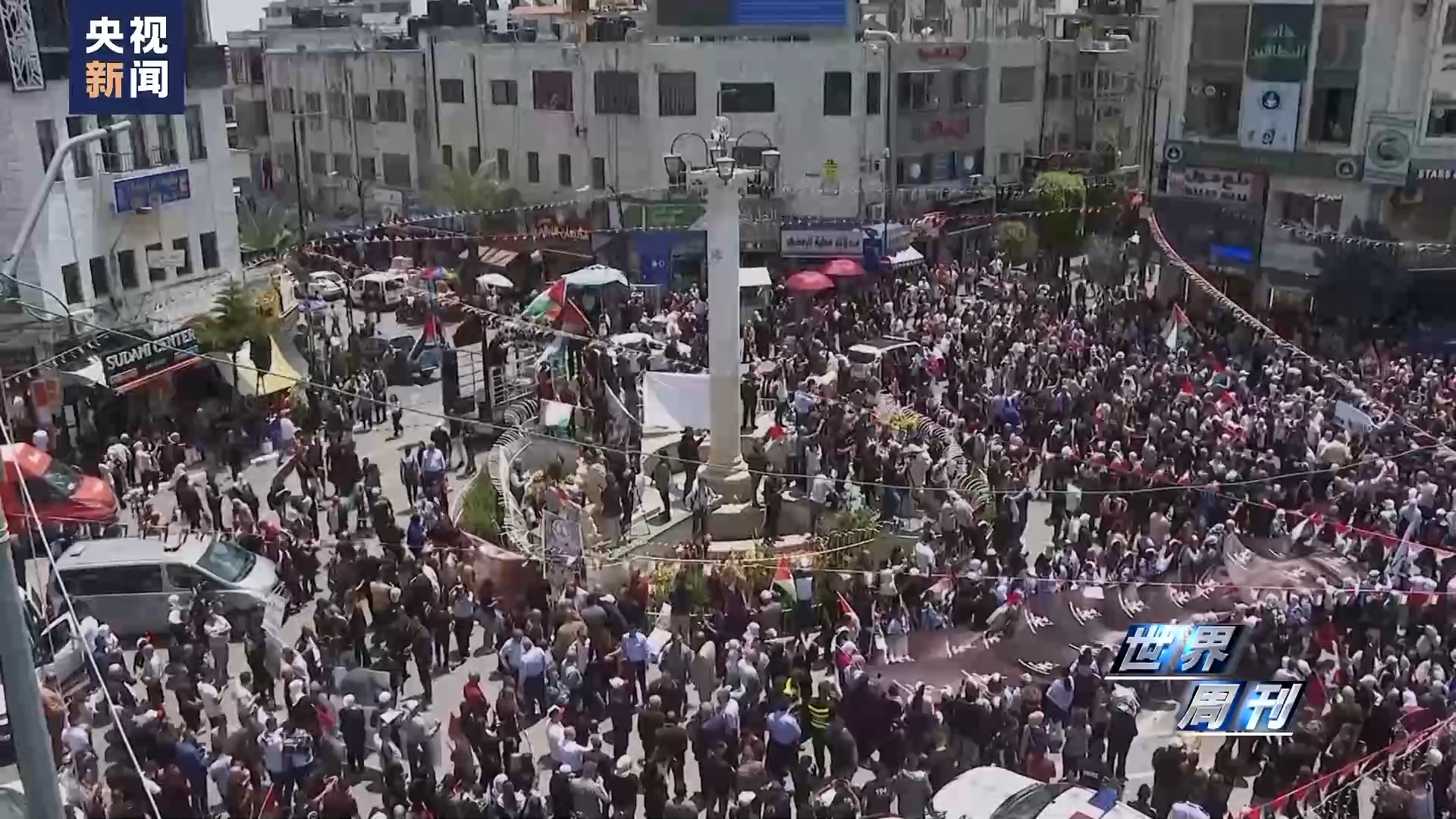 5月15日當天,約旦河西岸城市拉姆安拉,數(shù)千名民眾參與游行,他們高舉象征巴勒斯坦人民回歸權的鑰匙和象征沾滿鮮血的援助物資的道具,高呼口號,要求結束以色列占領以及巴勒斯坦人回歸故土。