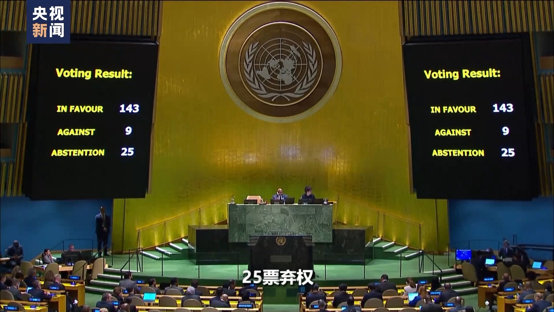 聯(lián)合國大會主席 丹尼斯·弗朗西斯:表決結果如下:143票贊成,9票反對,25票棄權。