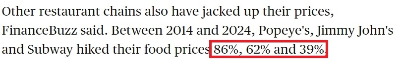 美國(guó)哥倫比亞廣播公司網(wǎng)站: 2014年至2024年間,“大力水手”“吉米·約翰”和“賽百味”的產(chǎn)品價(jià)格分別上漲了86%、62%和39%。