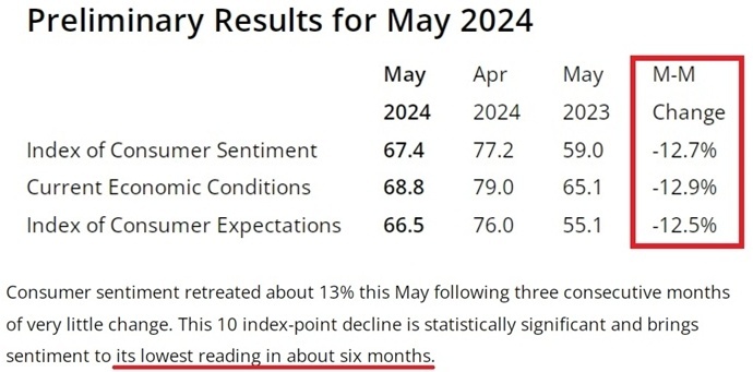 密歇根大學(xué)的最新調(diào)查顯示,由于預(yù)期通脹率和利率都將維持在高位,美國(guó)5月消費(fèi)者信心指數(shù)(CSI)在連續(xù)三個(gè)月幾乎持平后較上月大幅回落了約13%,降至約半年來(lái)的最低水平。