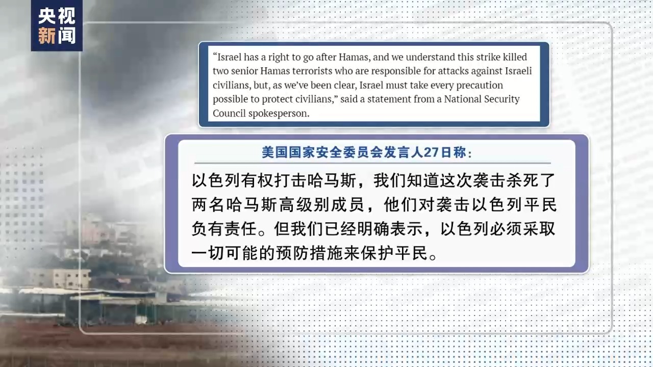 美國(guó)國(guó)家安全委員會(huì)發(fā)言人27日稱:以色列有權(quán)打擊哈馬斯,我們知道這次襲擊殺死了兩名哈馬斯高級(jí)別成員,他們對(duì)襲擊以色列平民負(fù)有責(zé)任。但我們已經(jīng)明確表示,以色列必須采取一切可能的預(yù)防措施來保護(hù)平民。