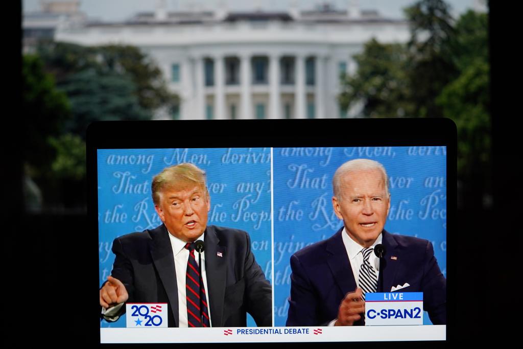 這張2020年9月29日在美國弗吉尼亞州阿靈頓拍攝的視頻畫面顯示,時(shí)任美國總統(tǒng)特朗普(左)與時(shí)任美國民主黨總統(tǒng)候選人拜登在俄亥俄州克利夫蘭市參加2020年美國總統(tǒng)候選人首場電視辯論。新華社記者 劉杰 攝
