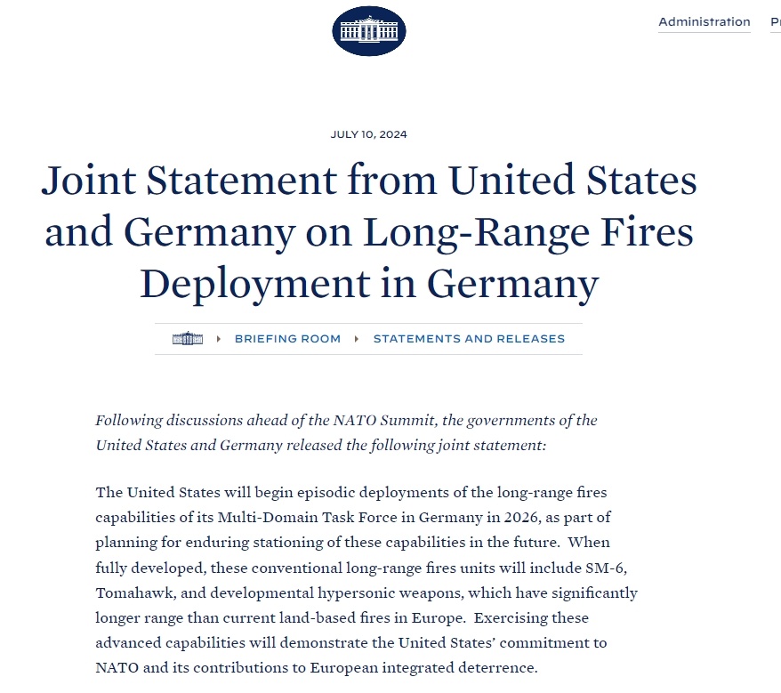 在上周的北約華盛頓峰會(huì)期間,美國(guó)和德國(guó)聯(lián)合宣布,作為長(zhǎng)期規(guī)劃的一部分,美國(guó)將從2026年開(kāi)始分階段在德國(guó)部署遠(yuǎn)程武器。