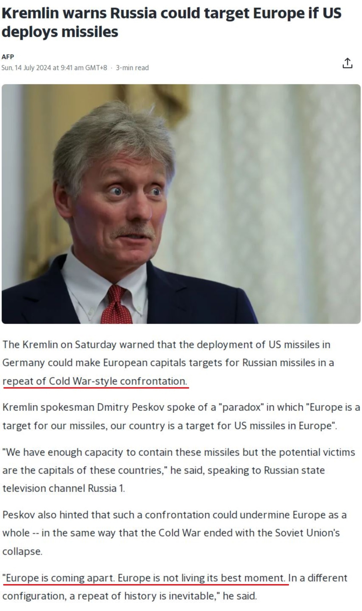 佩斯科夫警告,美國(guó)的最新舉動(dòng)可能會(huì)讓歐洲“重演冷戰(zhàn)式對(duì)抗”,“歐洲正在分崩離析。對(duì)歐洲來(lái)說(shuō),這絕不是最好的時(shí)刻”。