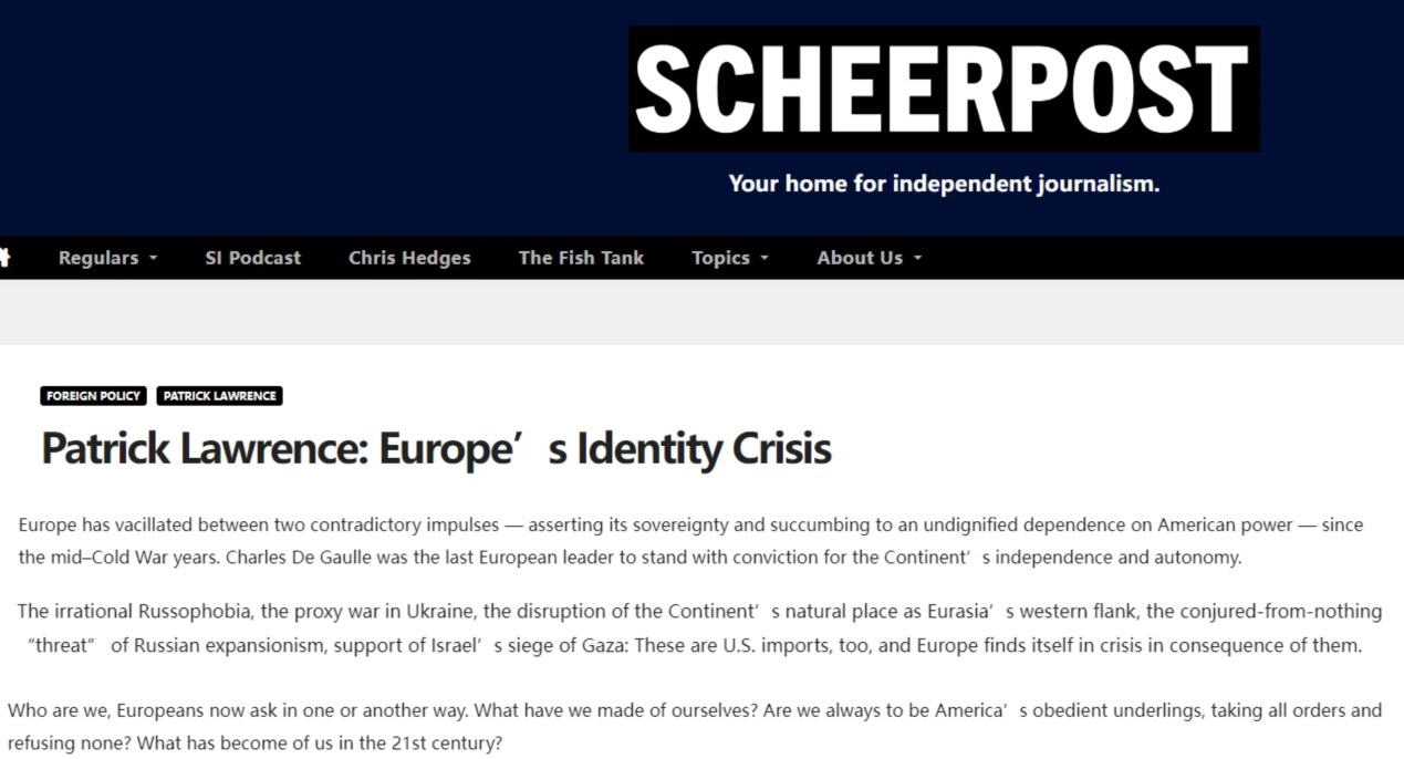 美國(guó)資深媒體人兼作家帕特里克·勞倫斯此前發(fā)文指出,自冷戰(zhàn)中期以來(lái),歐洲始終在“維護(hù)自身主權(quán)”和“對(duì)美國(guó)實(shí)力的無(wú)尊嚴(yán)依賴(lài)”這對(duì)矛盾之間搖擺不定。而美國(guó)重新把矛頭對(duì)準(zhǔn)俄羅斯后,更是在歐洲引發(fā)了嚴(yán)重的身份危機(jī)。