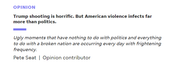 美國(guó)前白宮發(fā)言人、政治評(píng)論員皮特·西特(Pete Seat)日前在《今日美國(guó)報(bào)》(USA Today)網(wǎng)站刊文稱,特朗普在賓夕法尼亞州競(jìng)選集會(huì)上遭“未遂刺殺”之后,盡管美國(guó)的政界人士、評(píng)論家還有普通民眾都在說這起事件是美國(guó)“破碎政治的一個(gè)跡象”,但這其實(shí)是“一個(gè)支離破碎的國(guó)家所體現(xiàn)出來的癥狀”。
