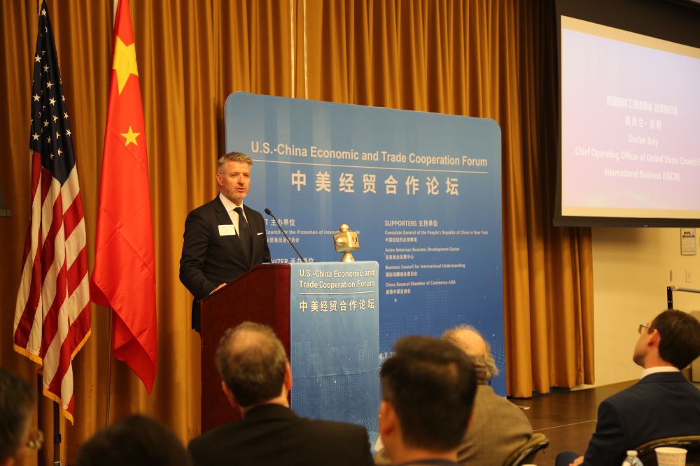7月29日,在美國紐約,美國國際工商理事會首席運營官戴克蘭·達(dá)利在中國—美國經(jīng)貿(mào)合作論壇上致辭。中國—美國經(jīng)貿(mào)合作論壇29日在紐約市舉行,300余位中美企業(yè)及商協(xié)會代表出席。新華社記者劉亞南攝