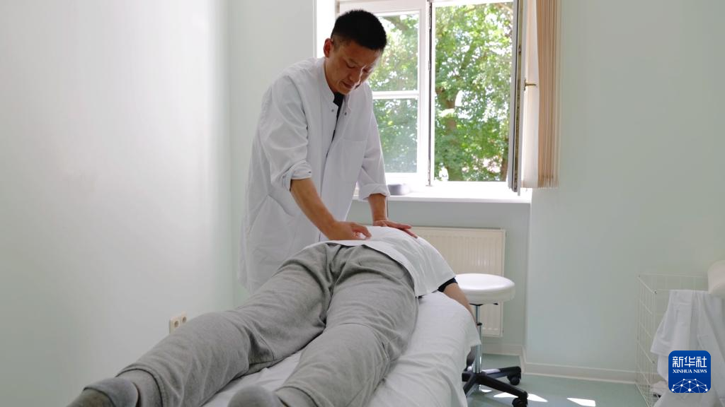 7月11日,在德國巴伐利亞州巴德魁茨汀,北京中醫(yī)藥大學魁茨汀醫(yī)院的中醫(yī)醫(yī)生幫病人進行推拿治療。 新華社記者 賈金明 攝