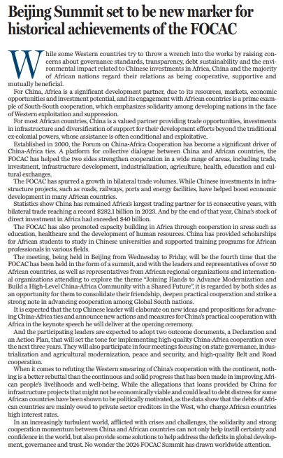 面對危機(jī)與挑戰(zhàn)增多、動蕩不安的當(dāng)今世界,中國與非洲國家間展現(xiàn)的團(tuán)結(jié)一致與強(qiáng)勁合作勢頭,不僅可以為世界注入更多確定性和信心,也可以為解決全球發(fā)展、治理和信任赤字提供方案。鑒于此,2024中非合作論壇峰會自然是全球矚目的焦點(diǎn)。