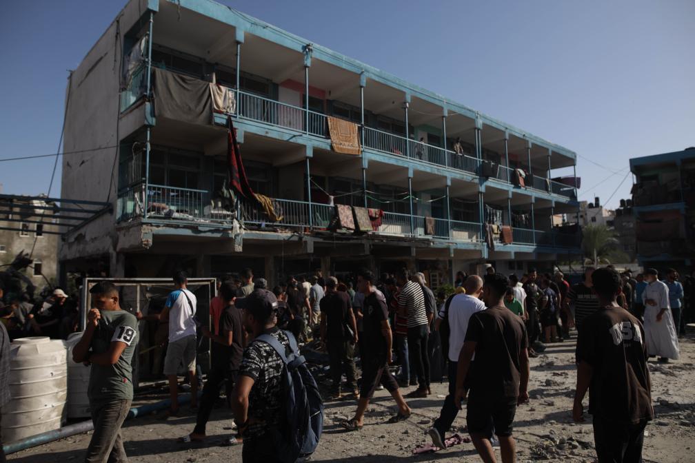 9月11日,在加沙地帶中部努賽賴特難民營,人們聚集在以軍轟炸后的學(xué)校廢墟附近。新華社發(fā)(馬爾萬·達烏德攝)