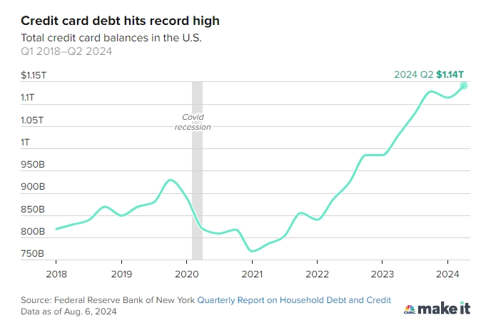2018年一季度至2024年二季度,美國信用卡債務(wù)總額創(chuàng)下歷史新高。(CNBC截圖)
