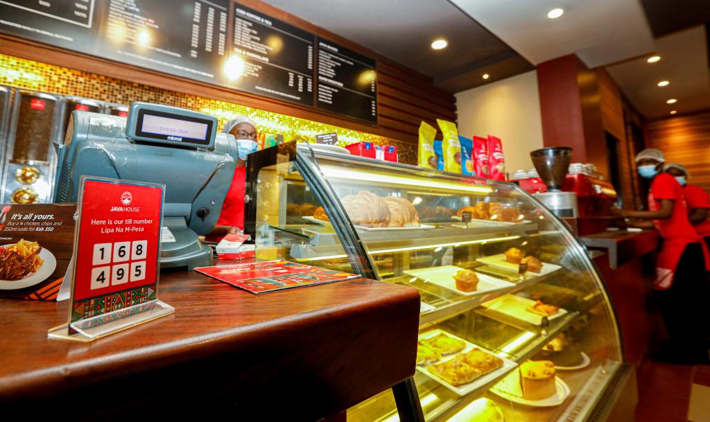 2021年9月16日,肯尼亞首都內(nèi)羅畢市中心一家咖啡店的收銀臺擺放著M-Pesa支付相關(guān)信息。新華社記者張宇攝