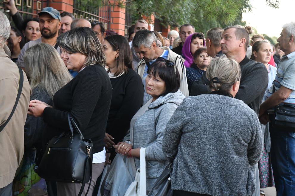8月13日,在俄羅斯庫爾斯克市,來自俄烏邊境地區(qū)的居民排隊(duì)領(lǐng)取救援物資。新華社發(fā)