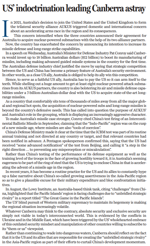 作為一個遠離全球和地區(qū)主要熱點的國家,購買核動力潛艇和遠程導彈超出了澳大利亞的防御需要。這不禁令人對“奧庫斯”的目的以及澳大利亞在其中的作用產生疑問,因為“奧庫斯”表現出越來越強的攻擊性。