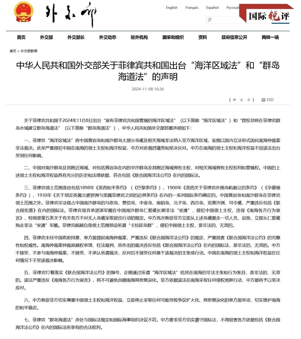 由此可見,菲方出臺的“惡法”違背了法律的基本精神,凸顯出政治操弄的本質(zhì)和非法擴張海洋權(quán)益的意圖。中國對南沙群島及其附近海域、對包括黃巖島在內(nèi)的中沙群島及其附近海域擁有主權(quán),對相關(guān)海域擁有主權(quán)權(quán)利和管轄權(quán),這些有著充分的歷史和法理依據(jù)。而菲律賓的領(lǐng)土范圍是由1898年《美西和平條約》(《巴黎條約》)、1900年《美西關(guān)于菲律賓外圍島嶼割讓的條約》(《華盛頓條約》)等一系列國際條約確定的,中國黃巖島和南沙群島均在菲律賓領(lǐng)土范圍之外。