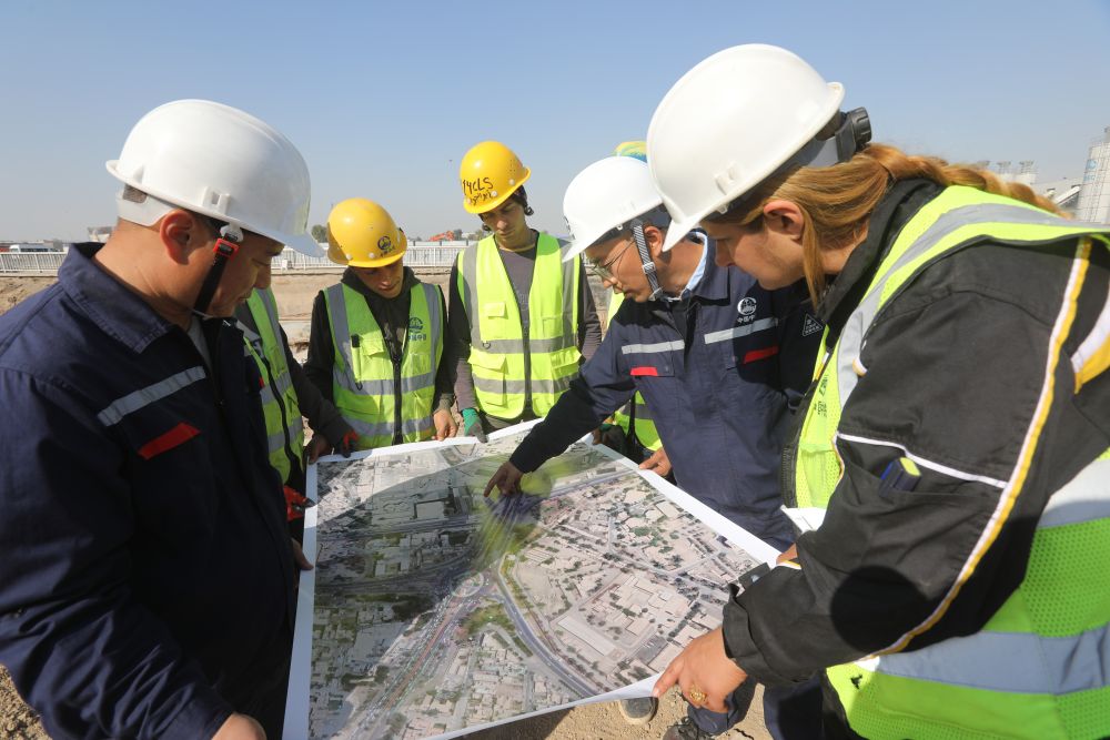 2024年3月2日,中伊員工在伊拉克巴格達(dá)尼蘇爾立體交通樞紐項(xiàng)目現(xiàn)場討論施工進(jìn)展。新華社發(fā)(哈利勒·達(dá)伍德攝)