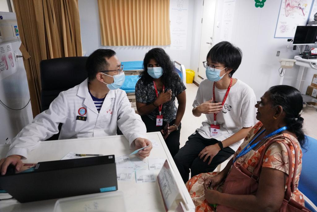 2024年12月24日,在斯里蘭卡科倫坡港,中國海軍“和平方舟”號醫(yī)院船上的醫(yī)生在志愿者的幫助下對當地患者進行問診。(新華社記者伍岳攝)