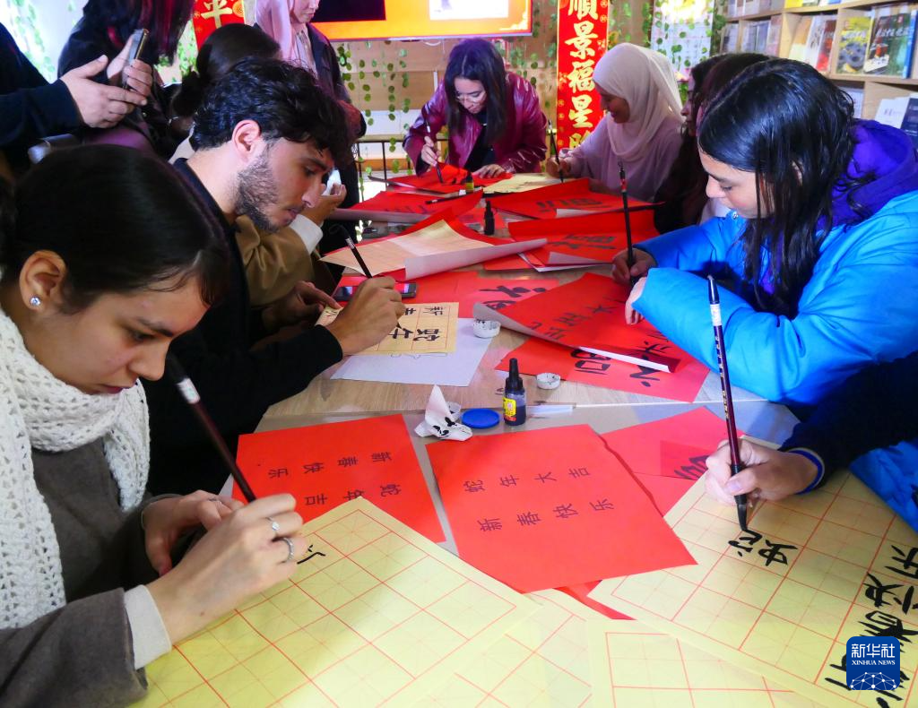 2月1日,在突尼斯首都突尼斯市東方知識(shí)書店,中文學(xué)習(xí)者在春節(jié)相關(guān)文化活動(dòng)中學(xué)寫祝福語。新華社發(fā)(黃靈攝)