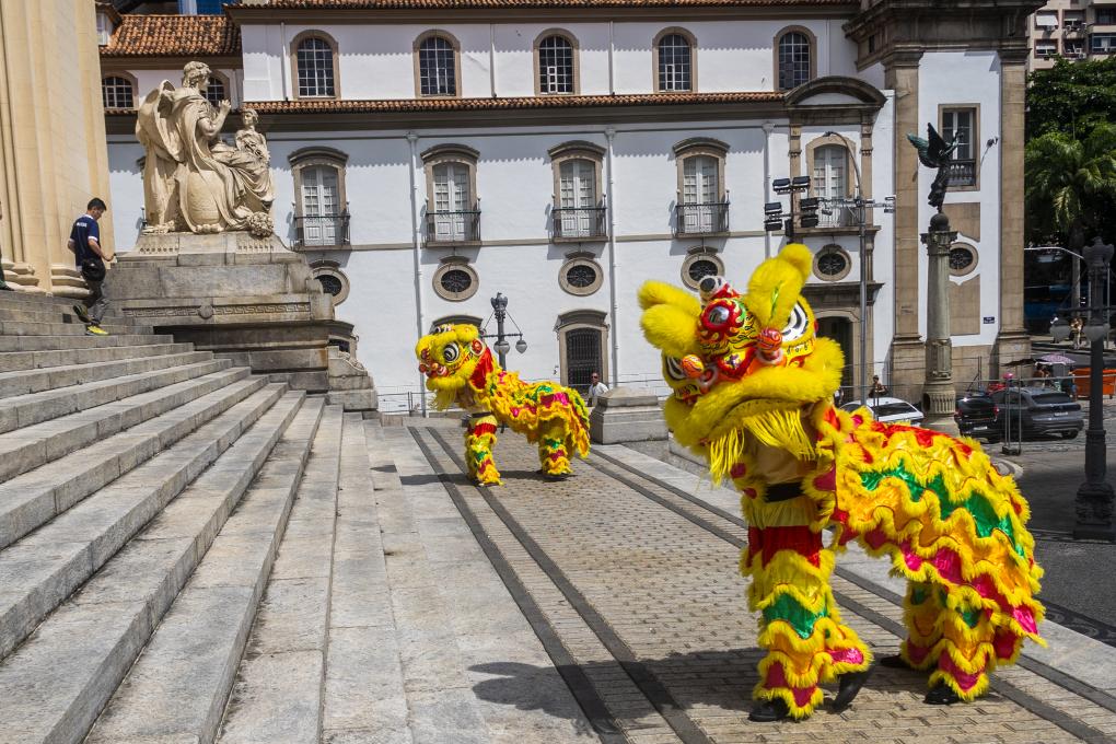 2月6日,在巴西里約熱內(nèi)盧州蒂拉登特斯宮(州議會(huì))大門外,演員在表演舞獅。新華社發(fā)(克勞迪婭·馬爾提尼 攝)