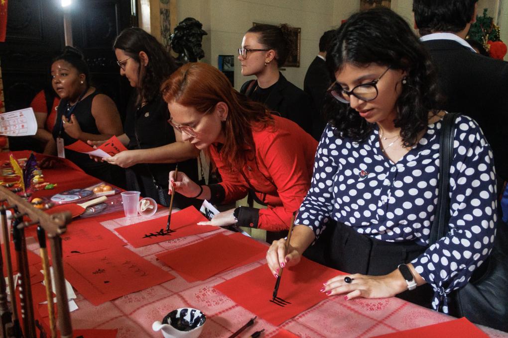 2月6日,在巴西里約熱內(nèi)盧州蒂拉登特斯宮(州議會(huì)),人們在體驗(yàn)書法。新華社發(fā)(克勞迪婭·馬爾提尼 攝)
