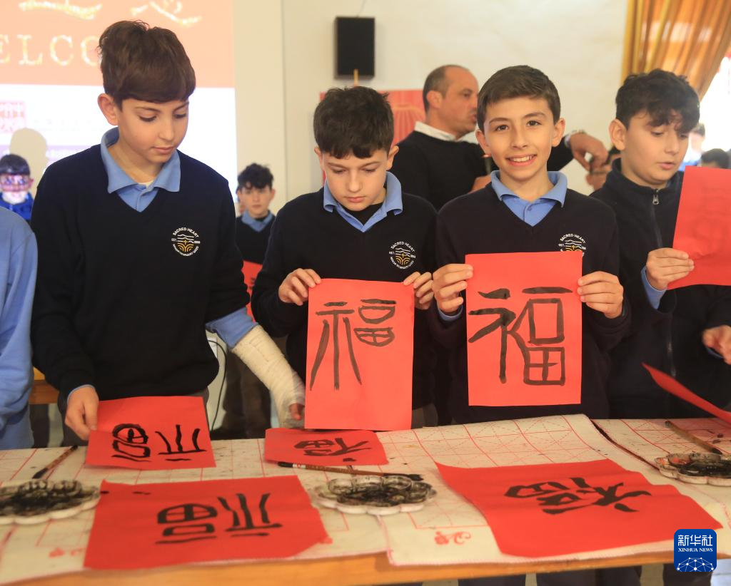 與此同時(shí),在學(xué)校禮堂內(nèi),學(xué)生們正在熱火朝天地體驗(yàn)中國(guó)書法藝術(shù)的獨(dú)特魅力。馬耳他中國(guó)文化中心的工作人員為學(xué)生們講解中國(guó)文房四寶的歷史淵源,現(xiàn)場(chǎng)演示書法基本技法。隨后,學(xué)生們興致勃勃地練習(xí)書寫,感受中國(guó)書法的韻味,他們?cè)谛埳狭粝碌哪E勾勒出對(duì)東方文化的向往。當(dāng)一個(gè)個(gè)工整的“?!弊?、“春”字躍然紙上時(shí),學(xué)生們興奮不已,互相欣賞彼此的作品。