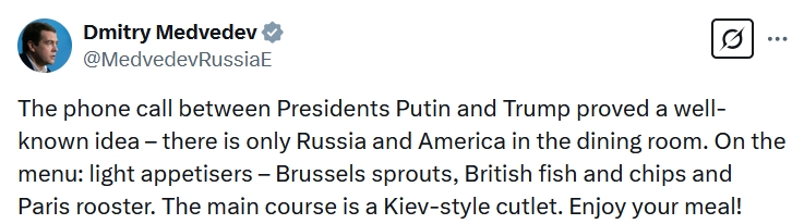 俄羅斯總統(tǒng)普京同特朗普18日通電話。俄聯(lián)邦安全會(huì)議副主席梅德韋杰夫就此表態(tài)稱,這表明餐廳里只有俄美,歐洲和烏克蘭都在菜單上,歐洲是開(kāi)胃小菜,而主菜是烏克蘭。