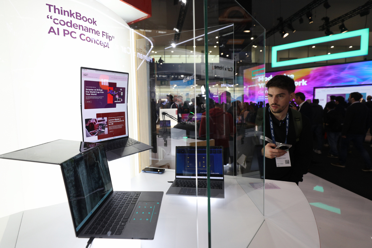 3月3日,在西班牙巴塞羅那舉行的2025年世界移動(dòng)通信大會(huì)上,一名男子在聯(lián)想展區(qū)參觀外折屏筆記本電腦ThinkBook Flip AI PC概念機(jī)。(圖片來(lái)源:新華社)
