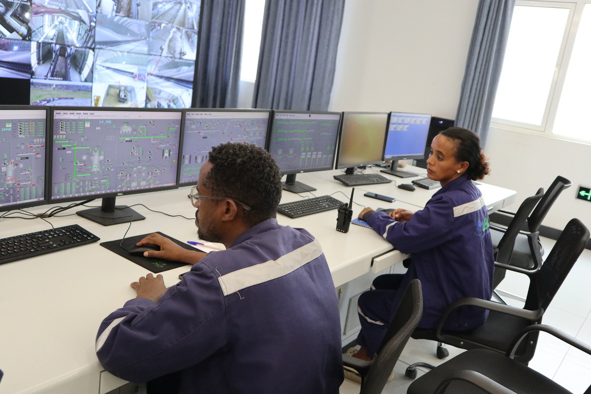 3月5日,當(dāng)?shù)貑T工在埃塞俄比亞萊米國(guó)家水泥廠的中控室工作。(圖片來(lái)源:新華社)