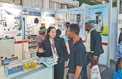 在一家中企展臺(tái),工作人員在向非洲客戶(hù)介紹該公司最新光伏儲(chǔ)能設(shè)備及其應(yīng)用場(chǎng)景。