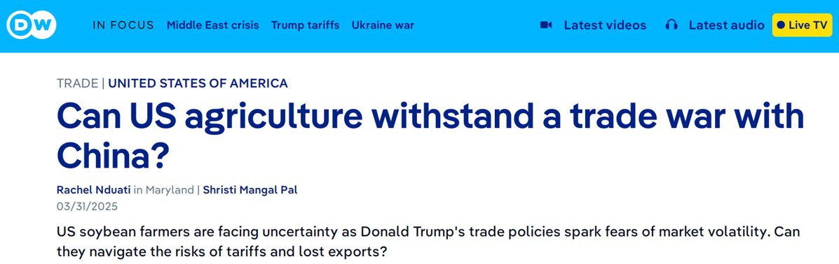 德國之聲3月31日報道稱,特朗普的貿(mào)易政策引發(fā)市場動蕩擔憂,美國大豆種植戶面臨巨大的不確定性。美國大豆出口,特別是對華出口,多年來一直在下降。特朗普貿(mào)易政策對農(nóng)民的全面影響可能要等到下一個收獲季才會完全顯現(xiàn)。