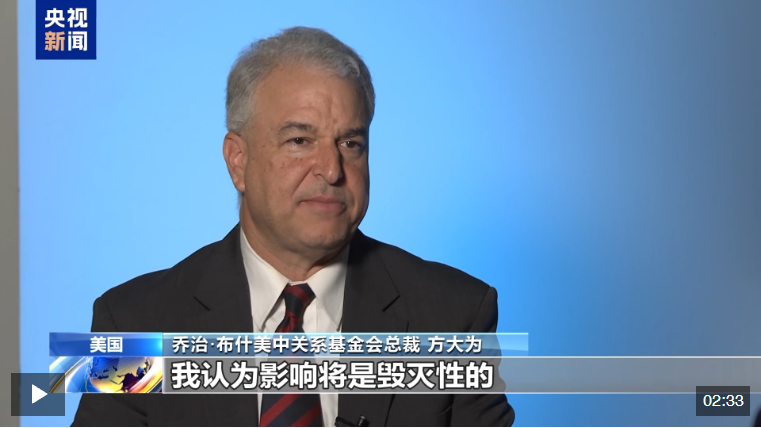 喬治·布什美中關(guān)系基金會總裁方大為6日在接受央視記者專訪時表示,美國政府新關(guān)稅政策的影響將是毀滅性的,不僅會使美國經(jīng)濟面臨更大的風險,引發(fā)的經(jīng)濟衰退更是對全球貿(mào)易體系的破壞?!?