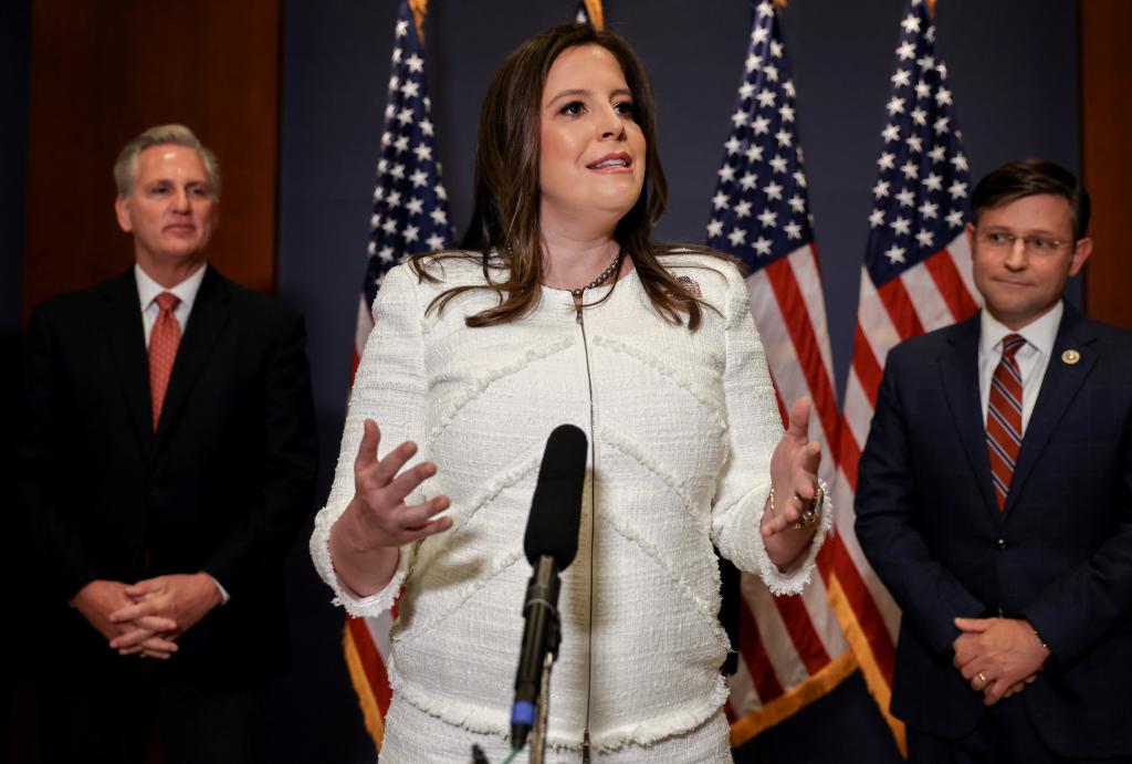 2021年5月14日,美國紐約州共和黨籍聯(lián)邦眾議員愛麗絲·斯蒂芬尼克在華盛頓國會山向記者講話。新華社/路透