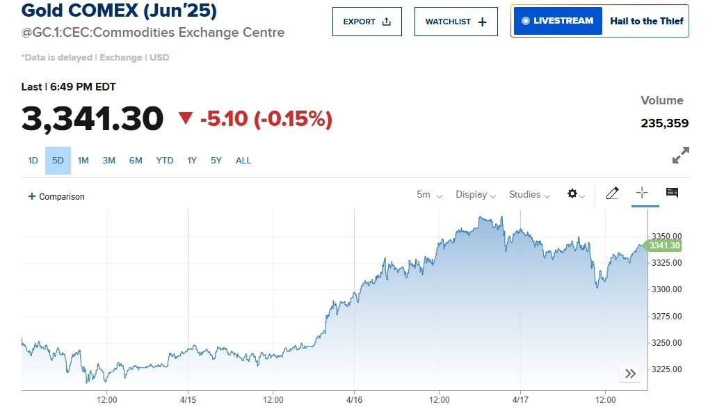 近期受美關(guān)稅政策影響,市場(chǎng)恐慌情緒蔓延,投資者投資策略偏向避險(xiǎn),進(jìn)而拉升國(guó)際金價(jià)的走高。美東時(shí)間4月18日,美國(guó)紐約商品交易所6月黃金期貨價(jià)格收于每盎司3341.30美元,較前一日小幅下跌,但仍處于高位。