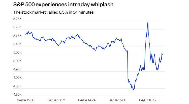 標(biāo)普500指數(shù)在7日開(kāi)盤(pán)暴跌后不久,因?yàn)椤凹傩侣劇庇绊?,?4分鐘內(nèi)大漲8.4%,但在收盤(pán)時(shí)盡數(shù)吐出。