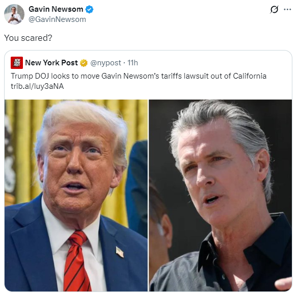 18日,美國(guó)加州州長(zhǎng)加文·紐森在社交媒體上發(fā)聲,他轉(zhuǎn)發(fā)了一則《紐約郵報(bào)》的新聞消息。這則新聞標(biāo)題為《特朗普的司法部似乎希望把紐森關(guān)稅訴訟的審理地挪出加州》。紐森在轉(zhuǎn)發(fā)消息時(shí)附加了一句評(píng)論:“你害怕了嗎?”