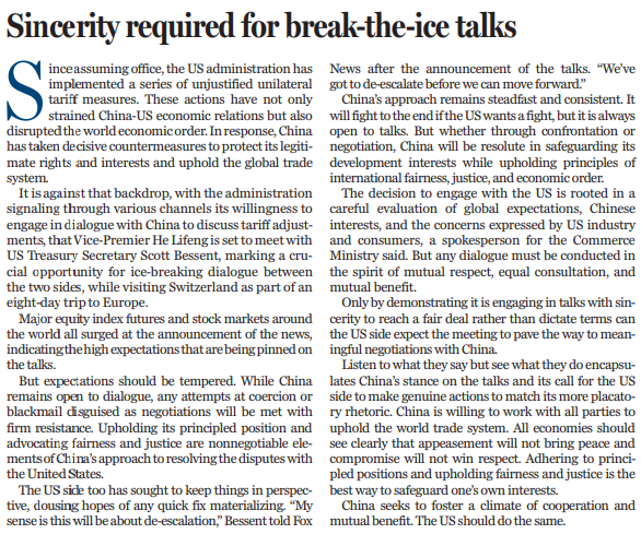 近期,美方不斷表示,希望同中方就關(guān)稅調(diào)整進行談判。當(dāng)?shù)貢r間10日上午,中美經(jīng)貿(mào)高層會談在瑞士日內(nèi)瓦開始舉行。中共中央政治局委員、國務(wù)院副總理何立峰作為中美經(jīng)貿(mào)中方牽頭人,當(dāng)天與美方牽頭人、美國財長貝森特舉行會談。中美關(guān)稅戰(zhàn)迎來破冰契機。