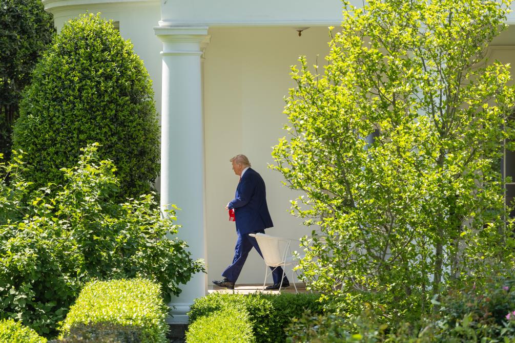 4月29日,在華盛頓白宮,美國總統(tǒng)特朗普走向南草坪準(zhǔn)備登機(jī)。新華社記者胡友松攝