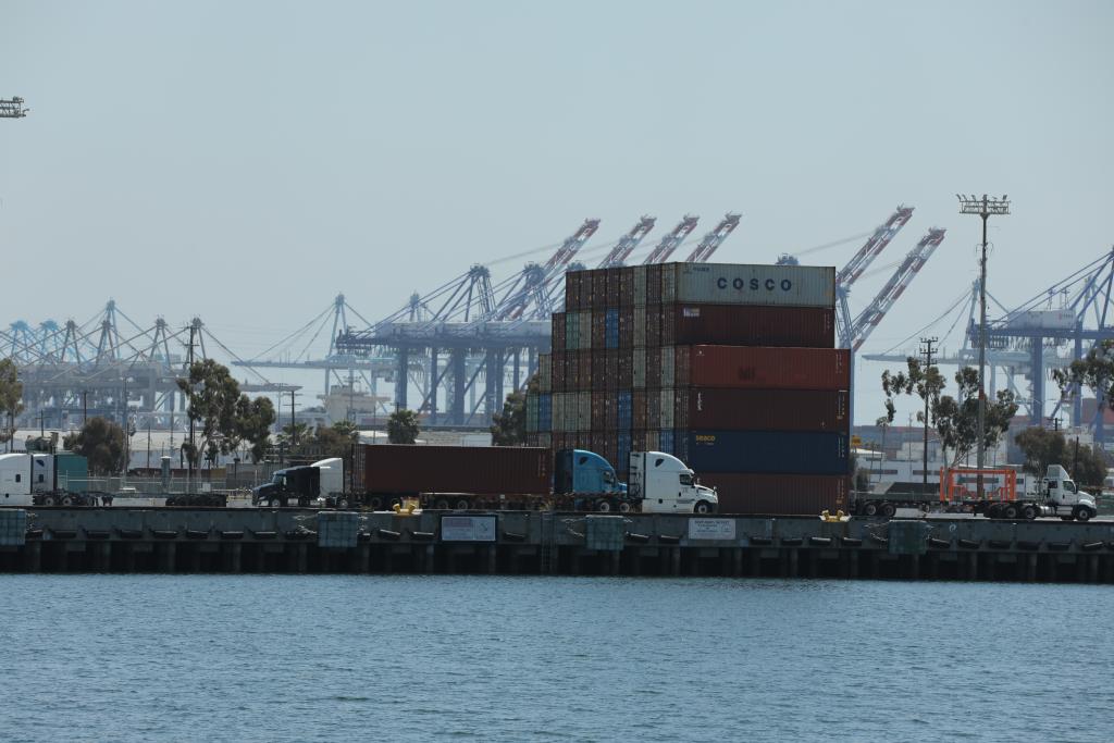 這是4月29日在美國洛杉磯港拍攝的集裝箱和卡車。洛杉磯港執(zhí)行董事吉恩·塞羅卡當(dāng)天表示,隨著美國關(guān)稅政策導(dǎo)致企業(yè)削減進(jìn)口訂單,洛杉磯港下周入境貨運(yùn)量預(yù)計(jì)將比去年同期下跌超過35%。新華社發(fā)(邱晨攝)