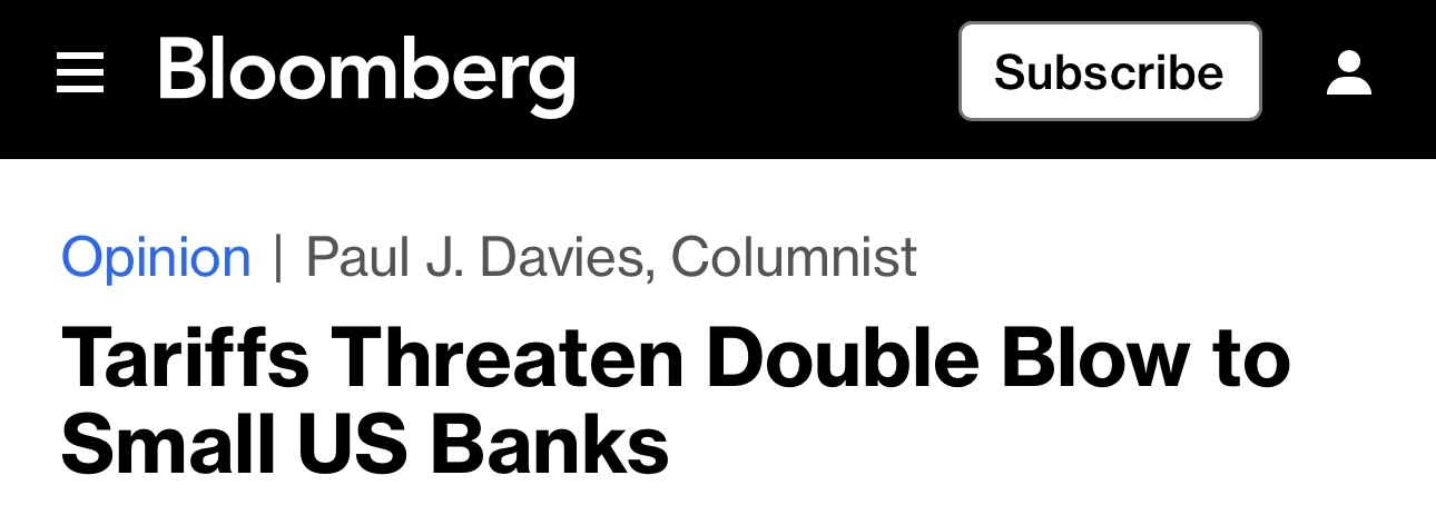 彭博社網(wǎng)站近日的一篇文章分析指出,關(guān)稅威脅對美國小型銀行造成雙重打擊。