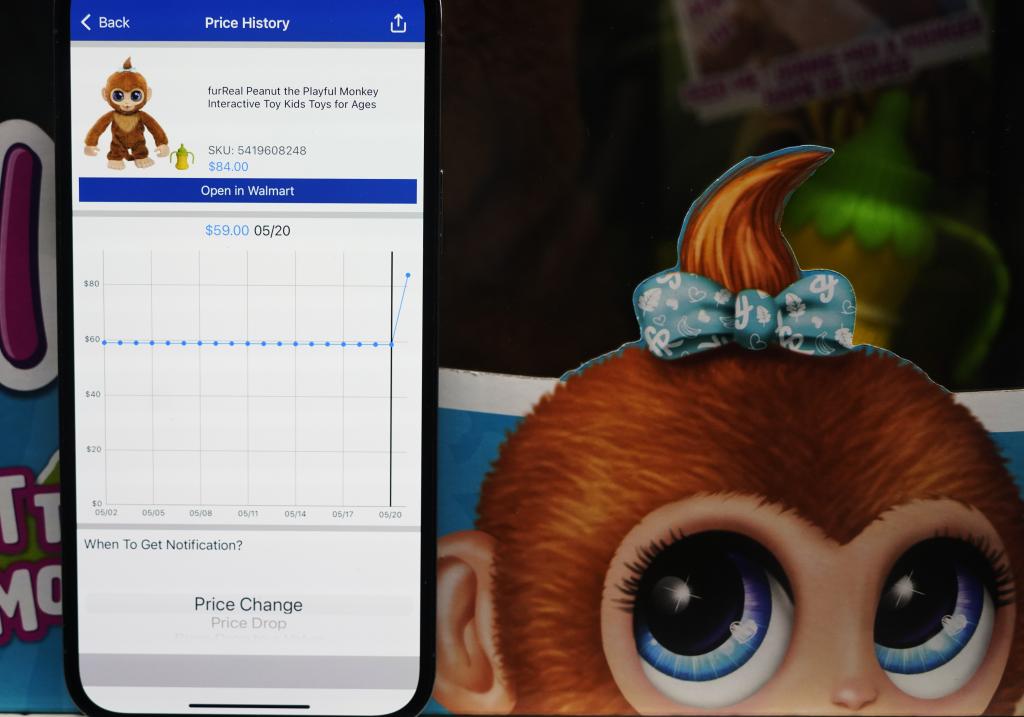 5月21日,在美國(guó)舊金山灣區(qū)圣利安卓San Leandro的一家沃爾瑪超市,價(jià)格跟蹤軟件(Walmart Tracker)顯示商品(中國(guó)產(chǎn)毛猴玩具)售價(jià)變化。新華社記者吳曉凌攝