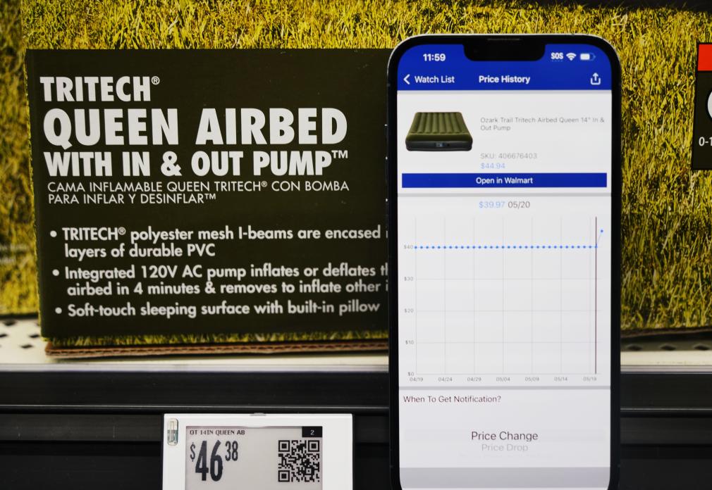 5月21日,在美國(guó)加利福尼亞州舊金山灣區(qū)圣萊安德羅的一家沃爾瑪超市,價(jià)格跟蹤軟件顯示一款中國(guó)產(chǎn)充氣床墊售價(jià)變化情況。新華社記者 吳曉凌 攝