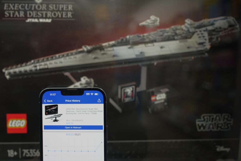 5月21日,在美國(guó)加利福尼亞州舊金山灣區(qū)圣萊安德羅的一家沃爾瑪超市,價(jià)格跟蹤軟件顯示一款星球大戰(zhàn)主題的樂(lè)高玩具售價(jià)變化情況。新華社記者 吳曉凌 攝
