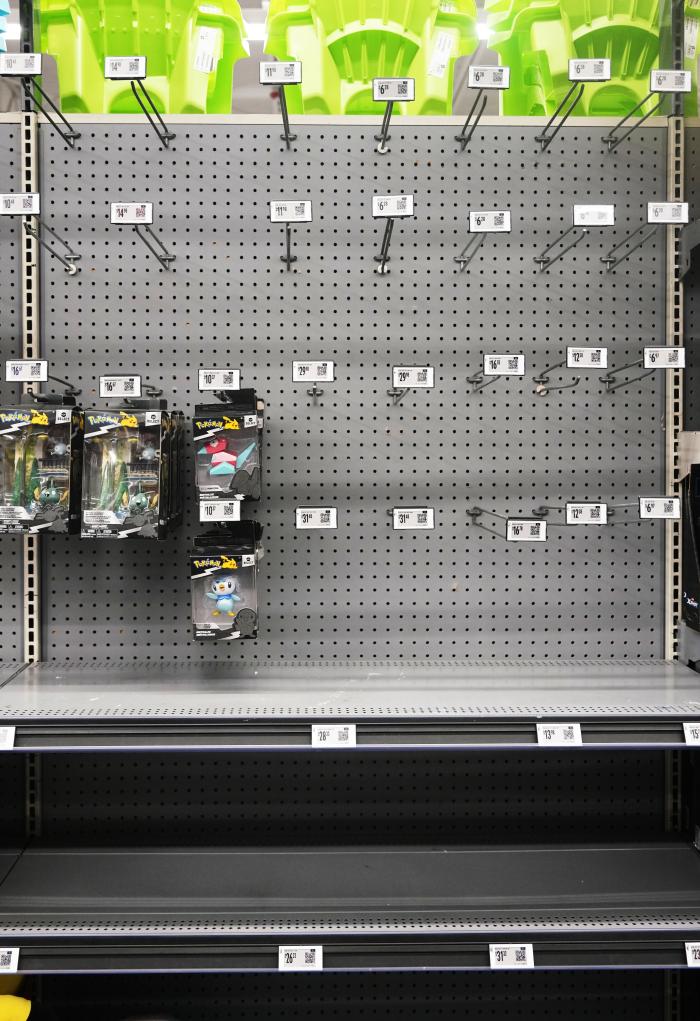 這是5月21日在美國(guó)加利福尼亞州舊金山灣區(qū)圣萊安德羅的一家沃爾瑪超市拍攝的空蕩的玩具貨架。新華社記者 吳曉凌 攝
