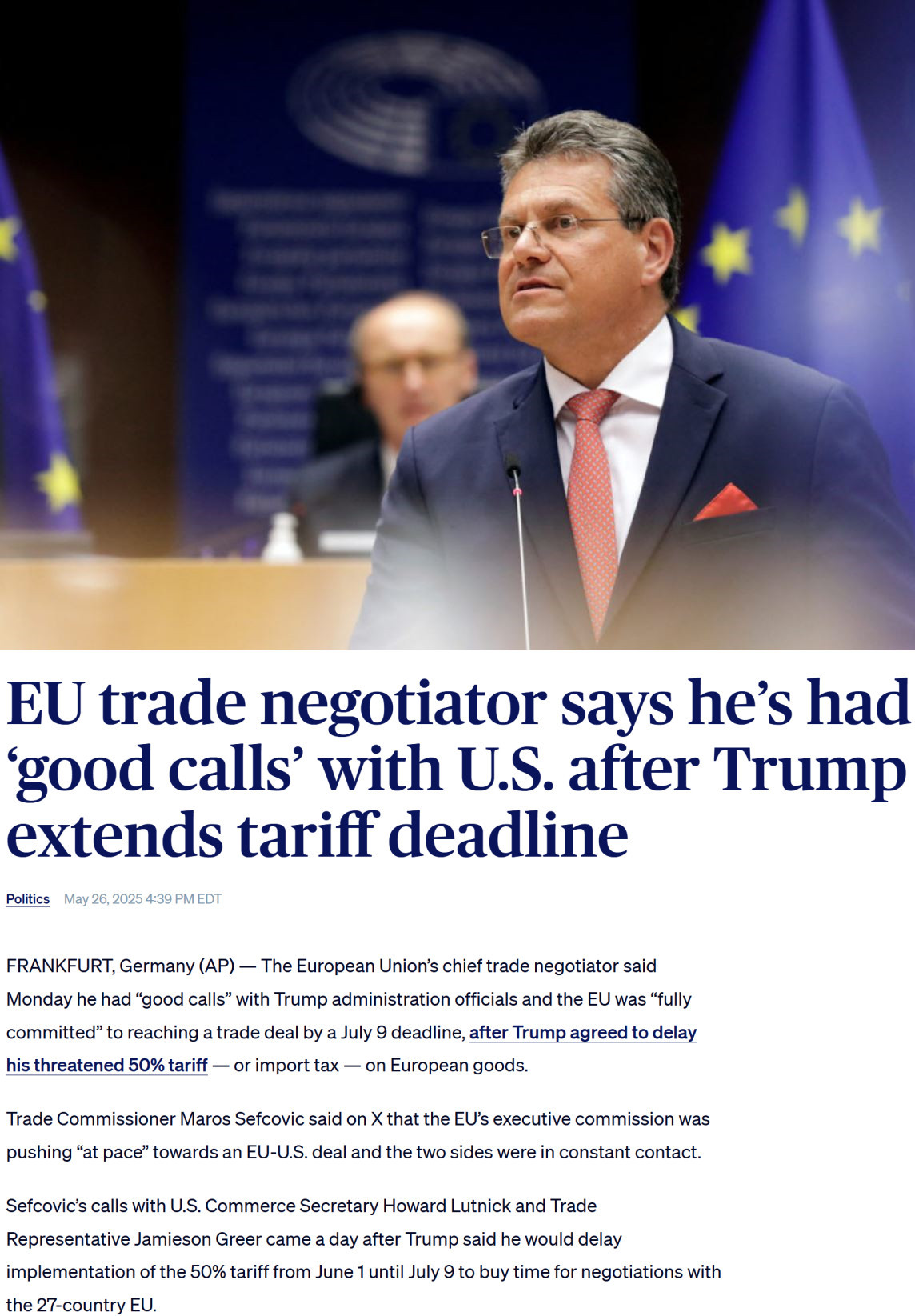 在歐盟委員會(huì)貿(mào)易委員謝夫喬維奇與美國(guó)貿(mào)易代表格里爾23日就關(guān)稅問(wèn)題通電話(huà)后,特朗普在社交媒體上發(fā)文抱怨說(shuō),歐盟在貿(mào)易問(wèn)題“很難打交道”,美歐貿(mào)易磋商“毫無(wú)進(jìn)展”。為此,他建議從6月1日起對(duì)歐盟商品征收50%的關(guān)稅。
