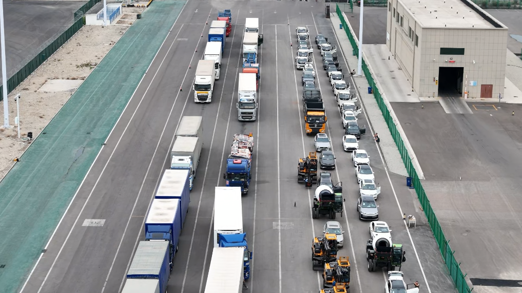 在霍爾果斯公路口岸,貨車、商品車、工程車等排成長(zhǎng)龍,從中國(guó)駛向哈薩克斯坦。