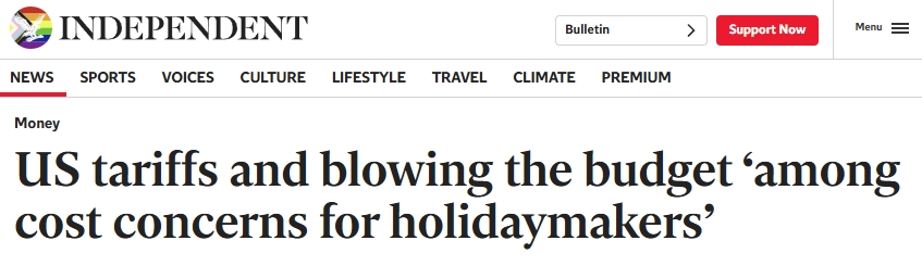此外,美國關(guān)稅政策的影響已外溢至國際層面,甚至影響了外國民眾的出行計劃。英國《獨(dú)立報》援引的一項報告顯示,78%的受訪者擔(dān)心美國貿(mào)易關(guān)稅可能對國外目的地的價格造成影響;53%的人計劃避開那些他們認(rèn)為關(guān)稅可能會推高國外目的地的物價;77%的人表示,匯率是他們的一大擔(dān)憂。